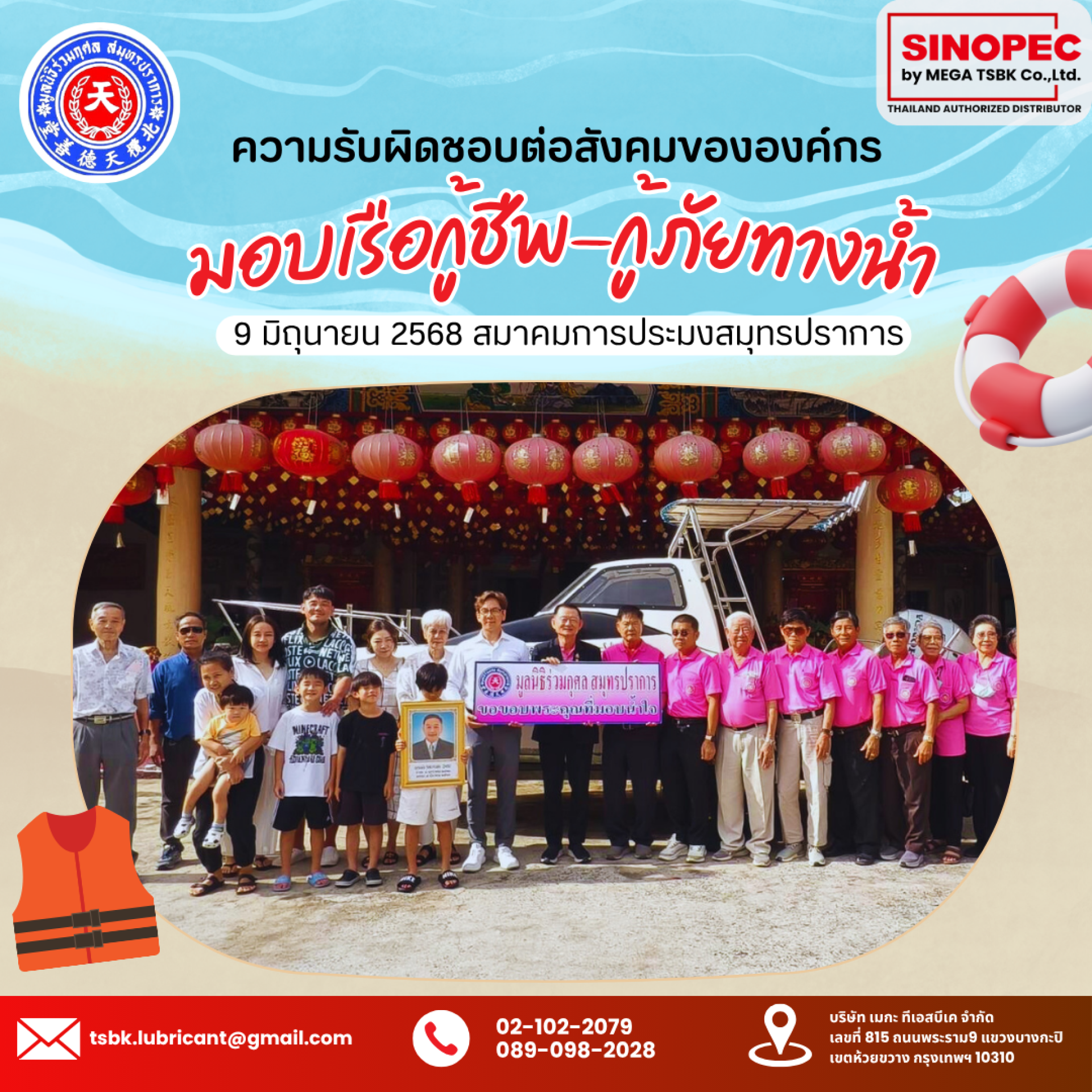 พร้อมกันนี้ขอขอบพระคุณ นายกิตติศักดิ์ วงศ์วิสุทธิ์ CEO บริษัท MEGA TSBK Co., Ltd. และครอบครัว ผู้บริหารบริษัท เมกะ ทีเอสบีเค จำกัด เป็นตัวแทนจำหน่ายอย่างเป็นทางการของน้ำมันหล่อลื่น SINOPEC ในประเทศไทย ที่ได้มอบเรือ Speed Boat มูลค่า 350,000 บาท เพื่อใช้ในภารกิจกู้ภัยทางน้ำเพื่อสาธารณประโยชน์